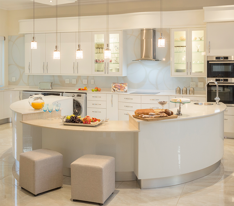 A bright, modern luxury kitchen featuring a unique curved island design. Soft pendant lighting illuminates the sleek white cabinetry, glass display cupboards, and stainless-steel appliances. The elegant breakfast bar, complete with plush seating, offers the perfect blend of style and comfort.