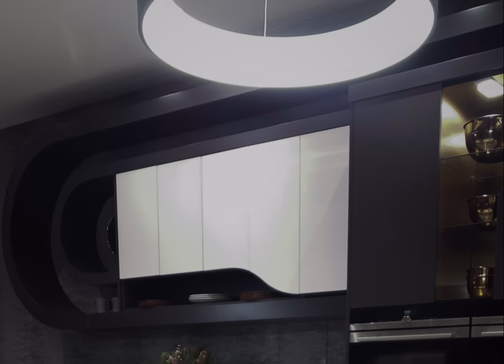This image highlights the sculptural, futuristic approach to upper cabinetry. Floating white cabinets are encased in a curved matte-black frame with soft lighting accents, creating a sense of depth and sophistication. The modern pendant lighting fixture above mirrors the circular motif, tying the design together with a sense of visual continuity. It’s a showcase of how functional elements can double as art in a luxury kitchen environment.