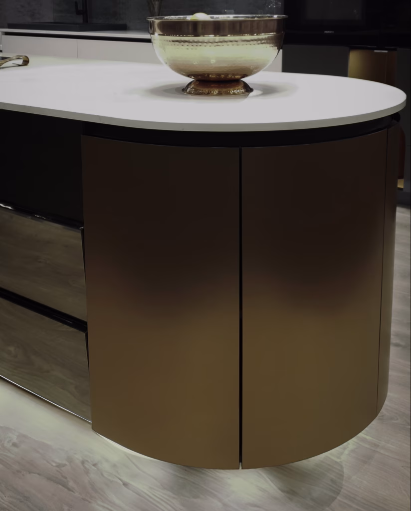 A closer look at the island’s rounded end reveals the precision and refinement behind its design. The metallic bronze panels softly curve to meet a seamless white countertop, creating a visual interplay of shape and sheen. Under-cabinet lighting casts a gentle glow, subtly highlighting the brushed texture of the floor and elevating the island’s elegant form. This detail showcases the craftsmanship and design intelligence embedded in every element of the kitchen.