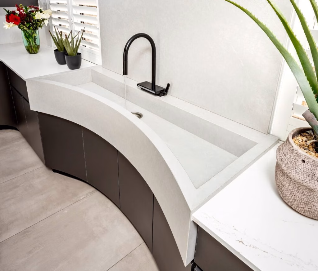 A seamless blend of style and function, this luxury curved kitchen sink design features a sleek matte-black faucet set against a soft, light-toned stone basin. The unique sweeping curve of the cabinetry creates a modern flow, while the combination of dark lower panels and pristine white countertops adds a sophisticated contrast. Accented with vibrant plants and natural textures, this space exudes contemporary elegance and refined craftsmanship.