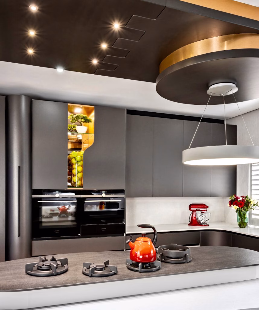 This sophisticated luxury kitchen combines bold architectural elements with modern finesse. The central island features a striking blend of matte and reflective finishes with soft golden bronze accents, while the surrounding cabinetry is framed by an eye-catching sculptural hood and layered ceiling panels with built-in lighting. Natural textures and dark-toned walls ground the space, offering a balanced harmony between high-end design and homely warmth. A perfect example of contemporary kitchen innovation.