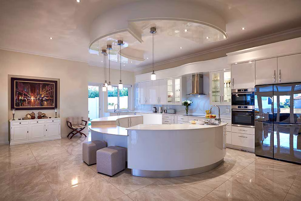 A spacious open-plan luxury kitchen showcasing the striking curved island as its center piece. The glossy marble floors and custom ceiling feature with pendant lights create an inviting, high-end atmosphere. Stainless-steel appliances and large windows complete the sophisticated look.